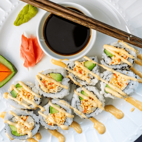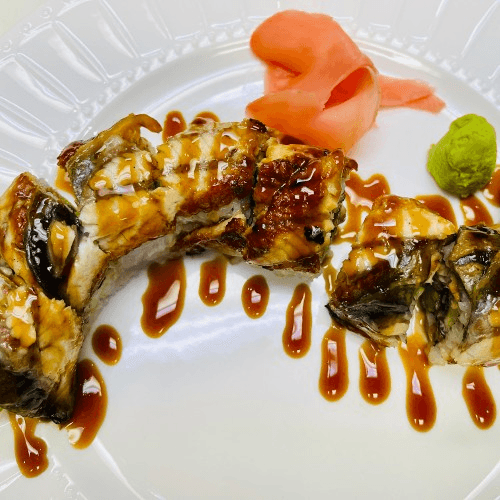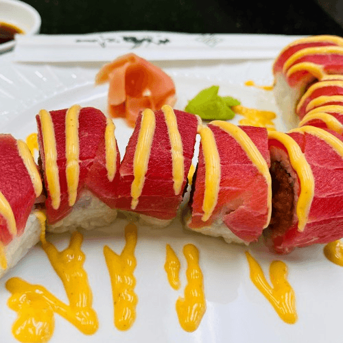 Choice of (Tuna, Spicy Tuna, Salmon, White Tuna, Cooked Shrimp, Crabmeat, Grilled Eel or Yellowtail), Sweet Tangy Mango, and Slices of Avocado on top with Kabayaki Sauce.