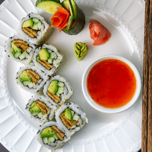 Vegetarian. Fried bean curd (Inari), avocado, and cucumber served with sweet chili sauce