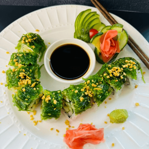 Vegetarian. Seaweed salad, spinach, cream cheese, avocado, cucumber, fried garlic, wasabi sauce (optional), and maje sauce