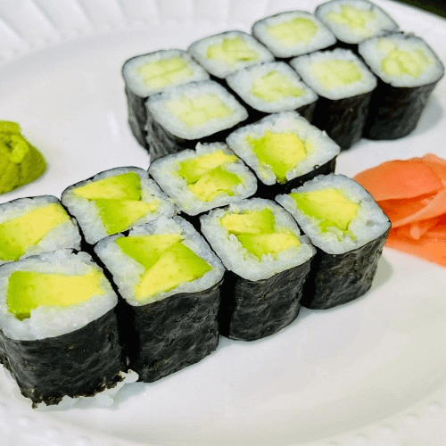 (Tuna, salmon, yellowtail or cooked shrimp) and avocado with our wasabi sauce. Some varieties contain raw fish