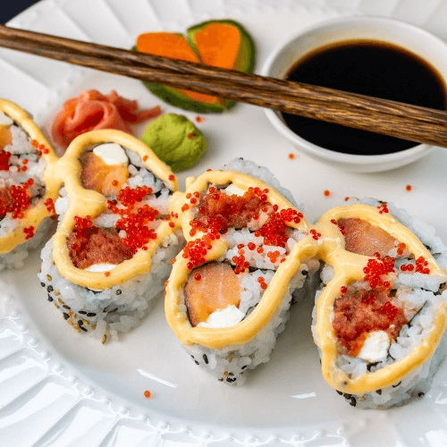 Spicy tuna, salmon, flying fish roe, cream cheese and maje special sauce