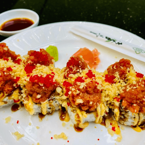 Spicy. Crab meat salad, cream cheese, spicy tuna, flying fish roe, crispy tempura, kabayaki sauce and maje special sauce